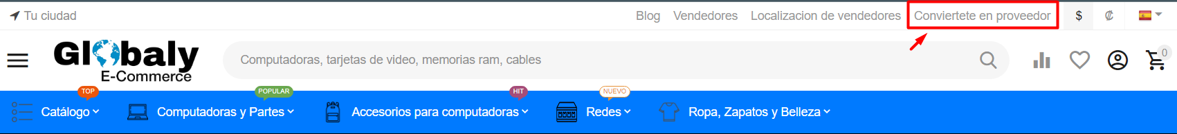 En la parte superior derecha de globaly notará un menú, debe presionar click sobre la sección "Conviértete en proveedor" como lo muestra en la siguiente imagen.