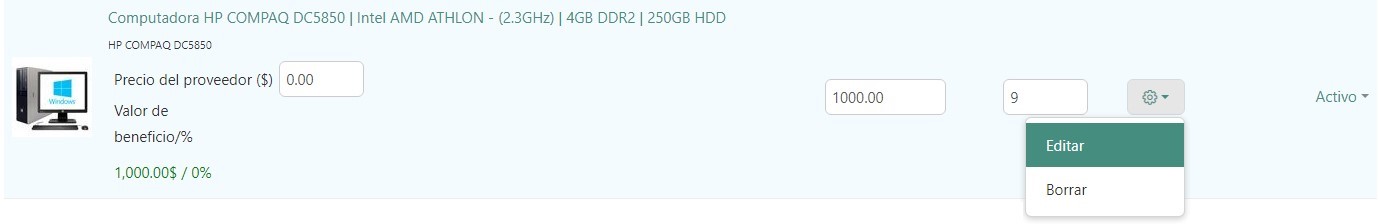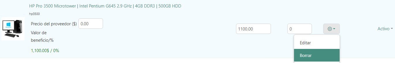 Para eliminar un producto específico, pase el puntero del mouse sobre el producto. Aparecerá el botón de engranaje del producto. Haga clic en él y elija Borrar.
