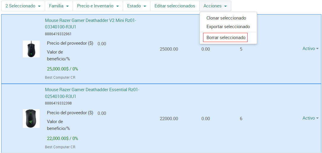 Para eliminar varios productos al mismo tiempo, selecciónelos haciendo clic en ellos y elija Borrar seleccionados en el menú Acciones sobre la lista de productos.