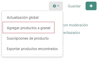 Para agregar productos a granel, haga clic en el botón de engranaje en la parte superior derecha de la página y elija Agregar productos a granel.