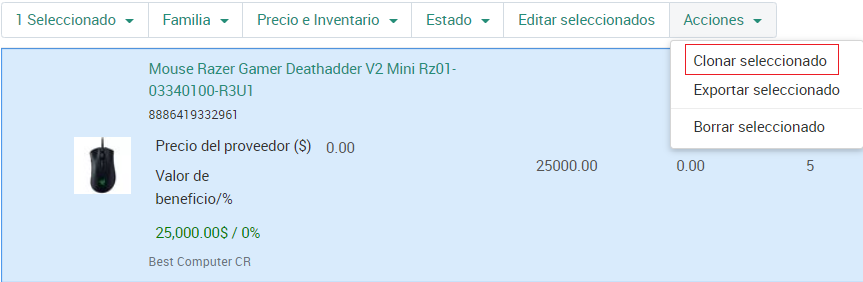 Para clonar un producto o varios productos, selecciónelos haciendo clic en ellos, luego elija Clonar seleccionado en el menú Acciones arriba de la lista de productos.