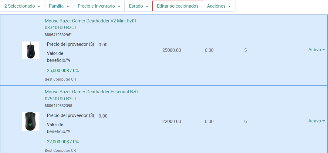 Para cambiar las propiedades de varios productos al mismo tiempo, seleccione esos productos haciendo clic en ellos, luego haga clic en Editar seleccionado encima de la lista de productos